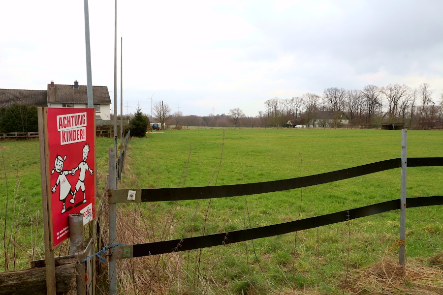 ASB_08-Asemissen: Nach dem Vorschlag der Bezirksregierung reicht das Siedlungsgebiet bis zu den Häusern im Hintergrund. Die Gemeindeverwaltung hat diese Fläche und die angrenzende Pferdewiese davon ausgenommen.