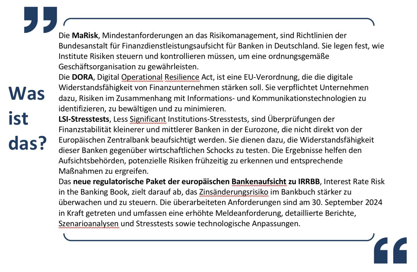 Bei der MaRisk gibt es regelmäßig Erweiterungen statt einen Abbau für kleine Institute. DORA ist ein äußerst wichtiges Thema. LSI steht für weniger bedeutende Institute, die keine direkte Relevanz für die Wirtschaft eines Landes haben. Dazu gehört auch die Volksbank Bad Salzuflen. Bei der IRRBB-Meldung musste unser Controller 3.000 Datenfelder füllen und melden.