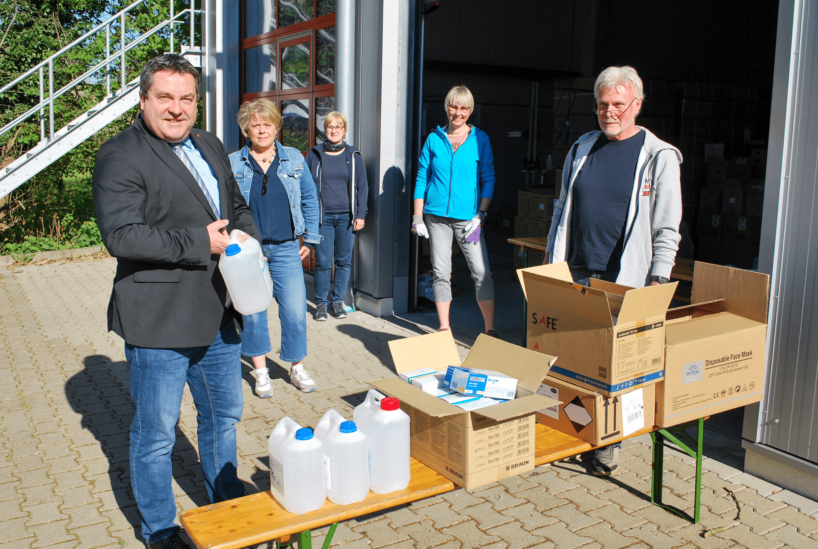Landrat Dr. Axel Lehmann macht sich ein Bild von der Verteilung der Schutzmaterialien. Anke Stetza, Ute Model und Anja Krause (von links) von der Pflege- […]